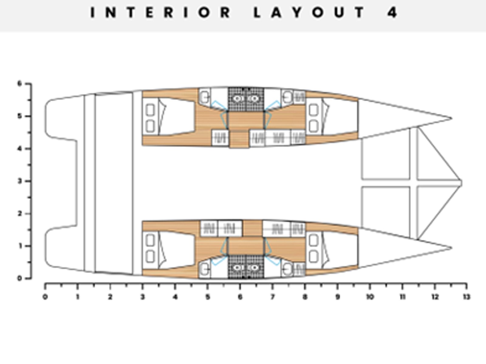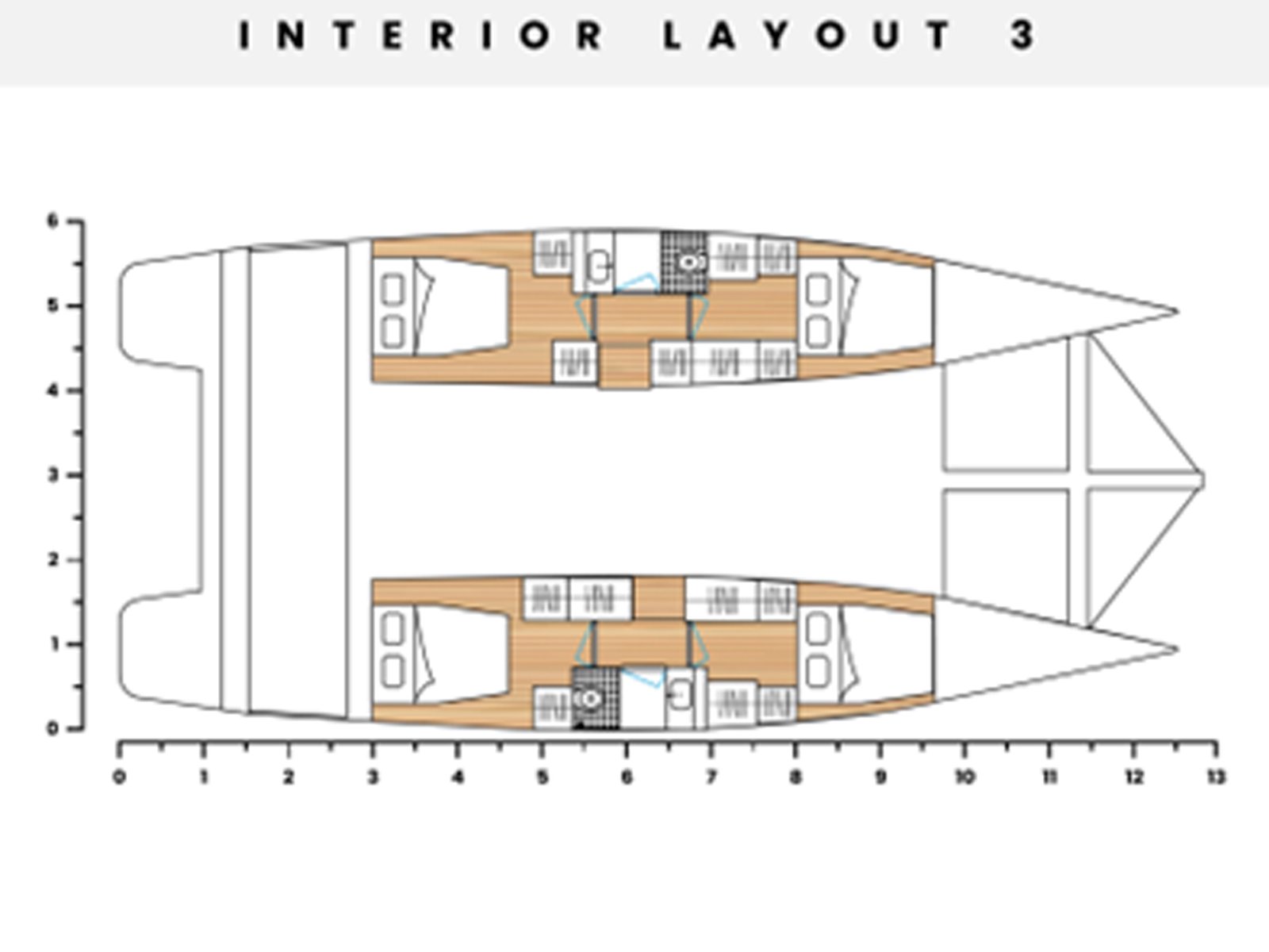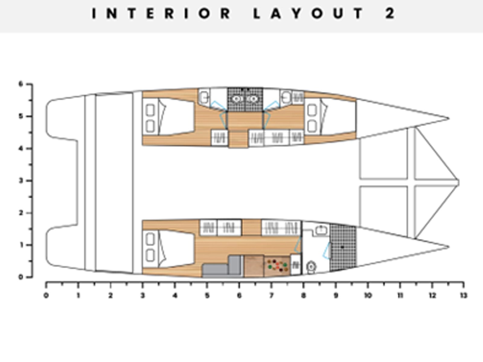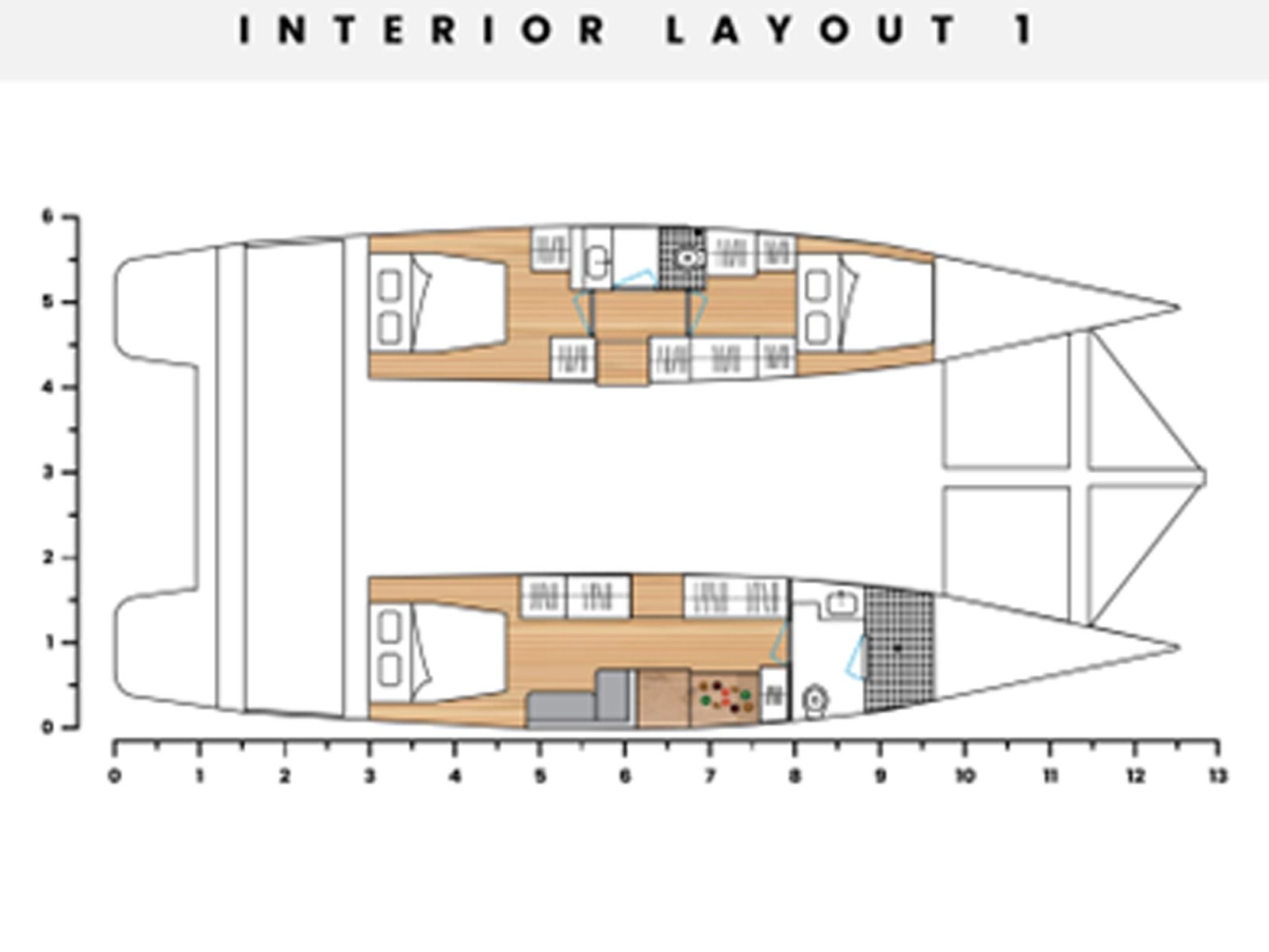 | Master bedroom as per selected layout Vinyl flooring Double bed with mattress and drawers Reading lights Wardrobe and drawers Table and armchair Guest cabin as per selected layout Vinyl flooring Double bed with mattress and drawers Reading lights Wardrobe and drawers Bathrooms as per selected layout Vinyl flooring Manual WC Shower Sink and faucet Accessories Cabinet | |