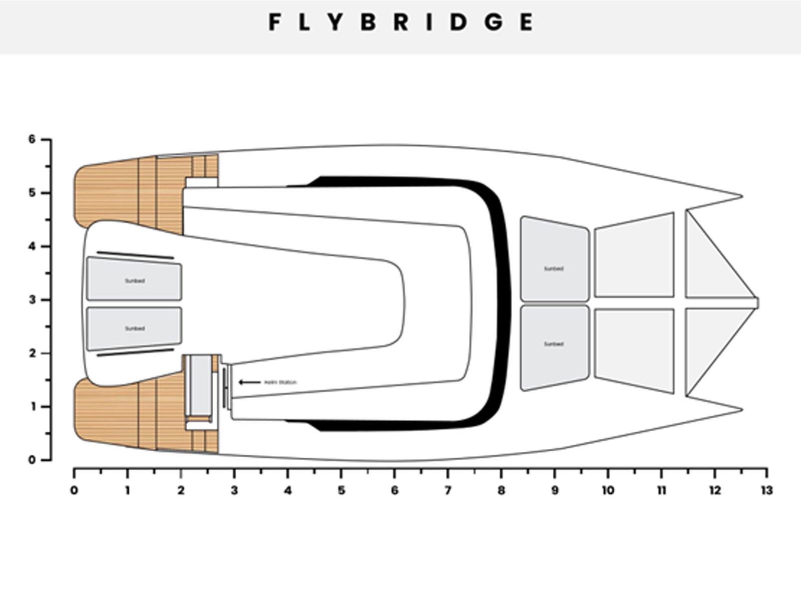 | Accessories 2 x side platforms at stern Stainless steel ladder Safety equipment locker Fenders locker Large locker at bow Stainless steel handrail 2 x fuel fillers 2 x water fillers 2 x black and grey water discharge outlets 2 x engine room access hatches | |