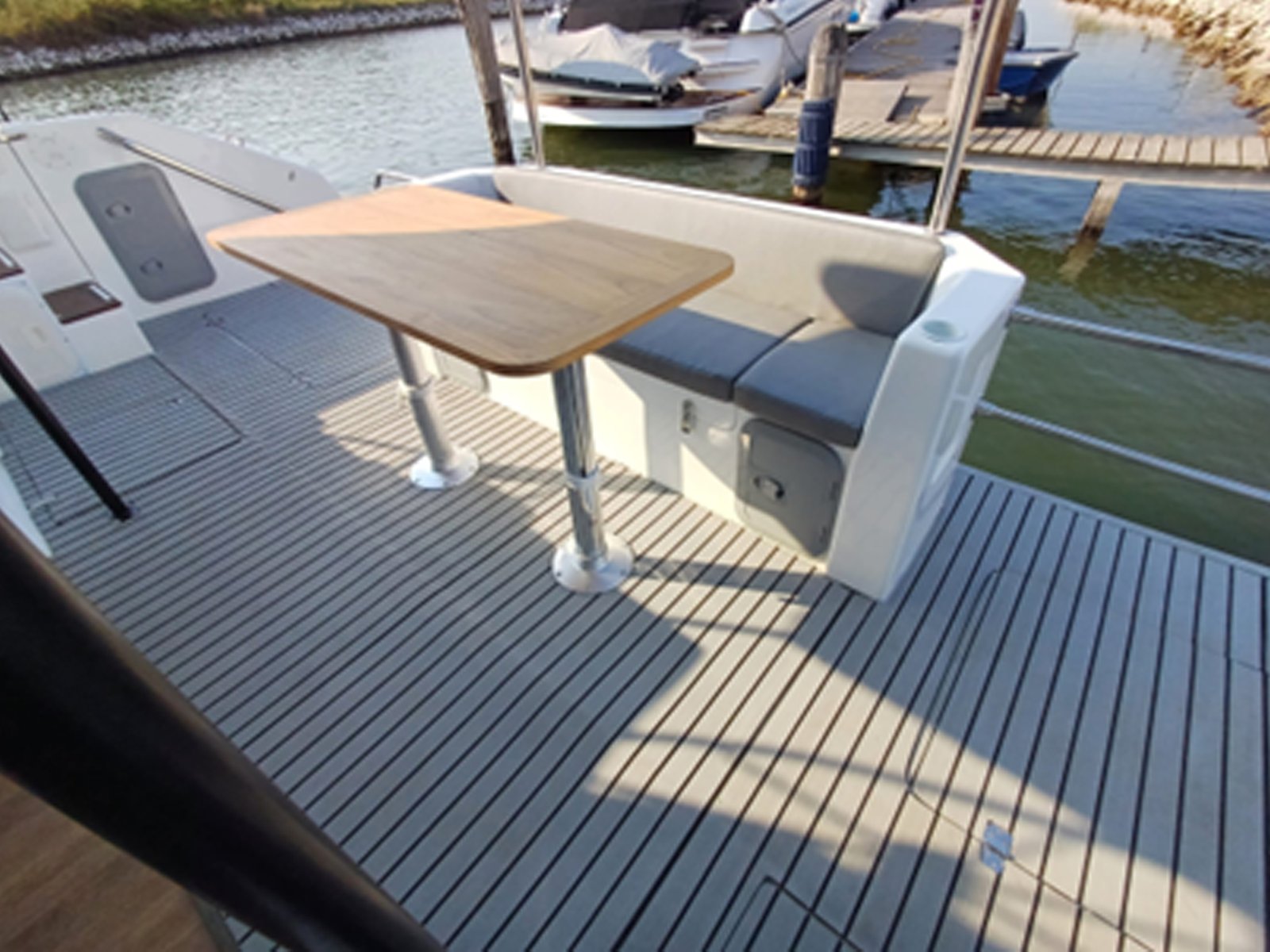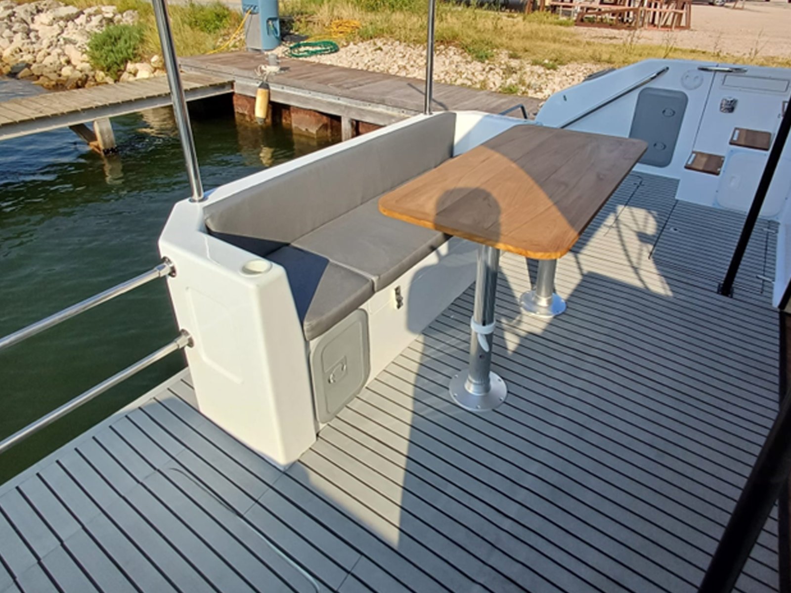 | Accessories 2 x side platforms at stern Stainless steel ladder Safety equipment locker Fenders locker Large locker at bow Stainless steel handrail 2 x fuel fillers 2 x water fillers 2 x black and grey water discharge outlets 2 x engine room access hatches | |